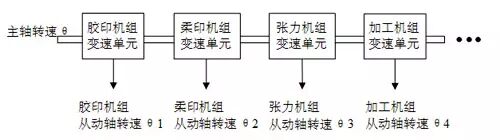 機組式卷筒印刷機一般由給紙機組、印刷機組、張力機組、加工機組和復卷機組等機組組成。在傳統的有軸傳動印刷機中,動力源由異步電機通過皮帶輪帶動一根機械長軸(約10-20m),然后通過長軸帶動各機組的齒輪、凸輪、連桿等傳動元件,再通過傳動元件帶動設備的執行元件完成設備的輸人、輸出任務。